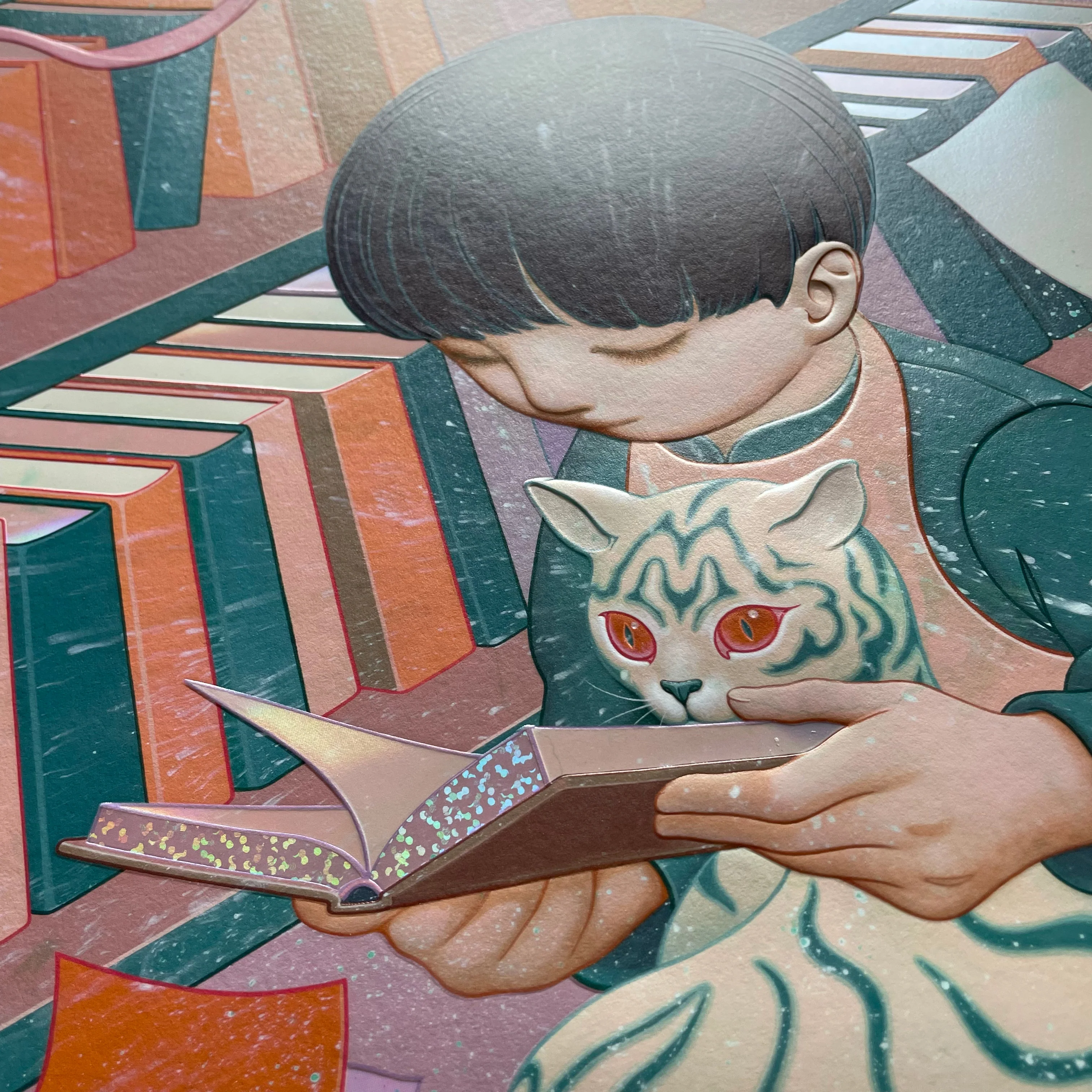 Reading by candlelight, the Bibliophile is lost in the stacks, where each leaf reveals a pulpy expanse of possibility. Flames lick the frayed edges of his tunic and bookends come to life. With each chapter conquered, the stacks grow into walls, and the walls grow into a labyrinth from which there is no escape. In our most complex print yet, the edges of each book's pages are gilded with precision in multiple types of foil, requiring 21 passes through the press to complete the entire composition. Carefully sculpted details can be found throughout.
