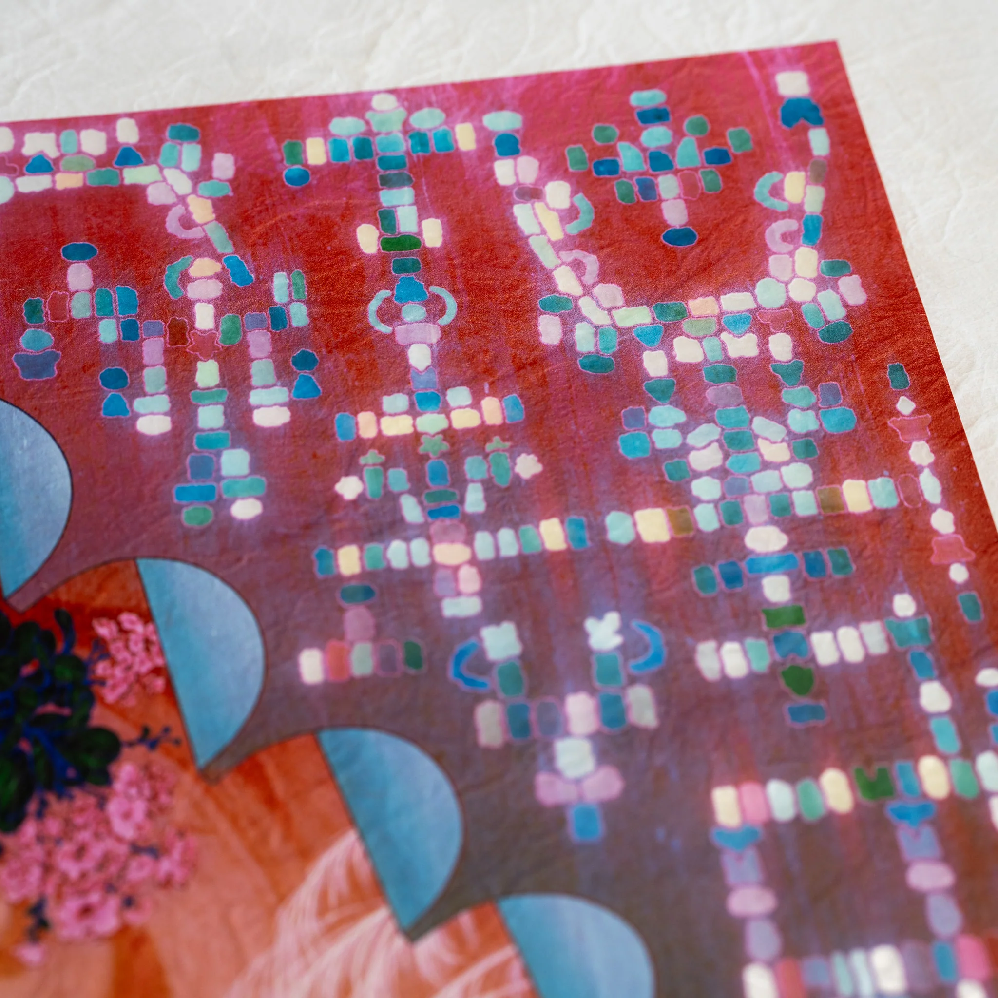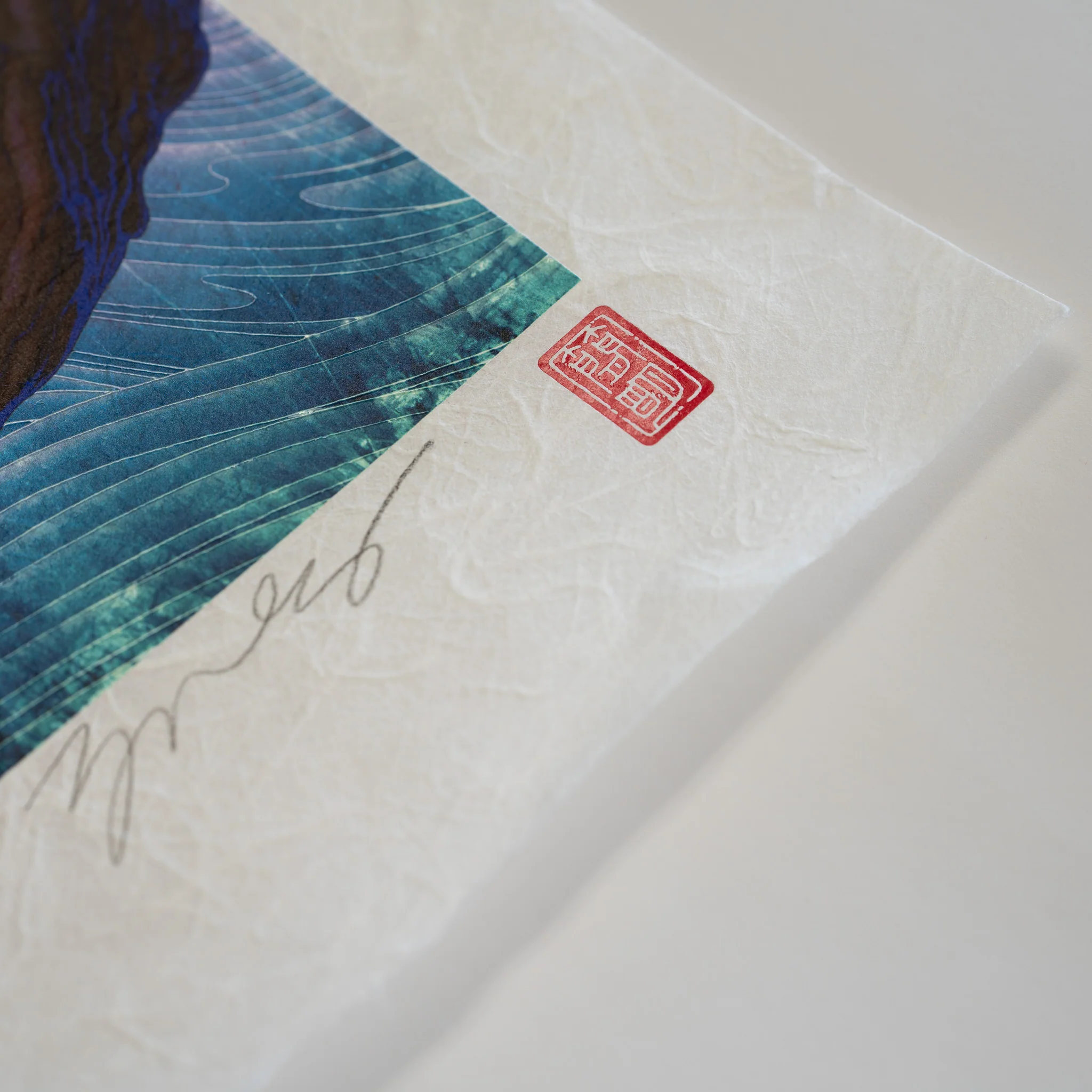 I wanted the print itself to function as a vessel of light. I discovered an extraordinary material called Unryu-shi, or “cloud dragon paper”, composed of long, resilient kozo fibers that spread like veins through delicate connective tissue. It proved to be an astonishing and fitting substrate, something my printmaker, Brad Keech, and I had never attempted before. Gloss accents the water flowing from the crepe myrtle bonsai above, while the musical notation in the corners, drawn from Man-su’s daughter's imagination, glows like stained glass in the light.